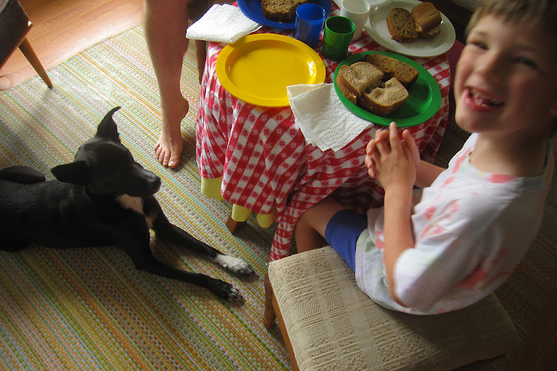 tablecloth, plate colors & seat assignments chosen by G = Aunt Kim got the pink stool :)